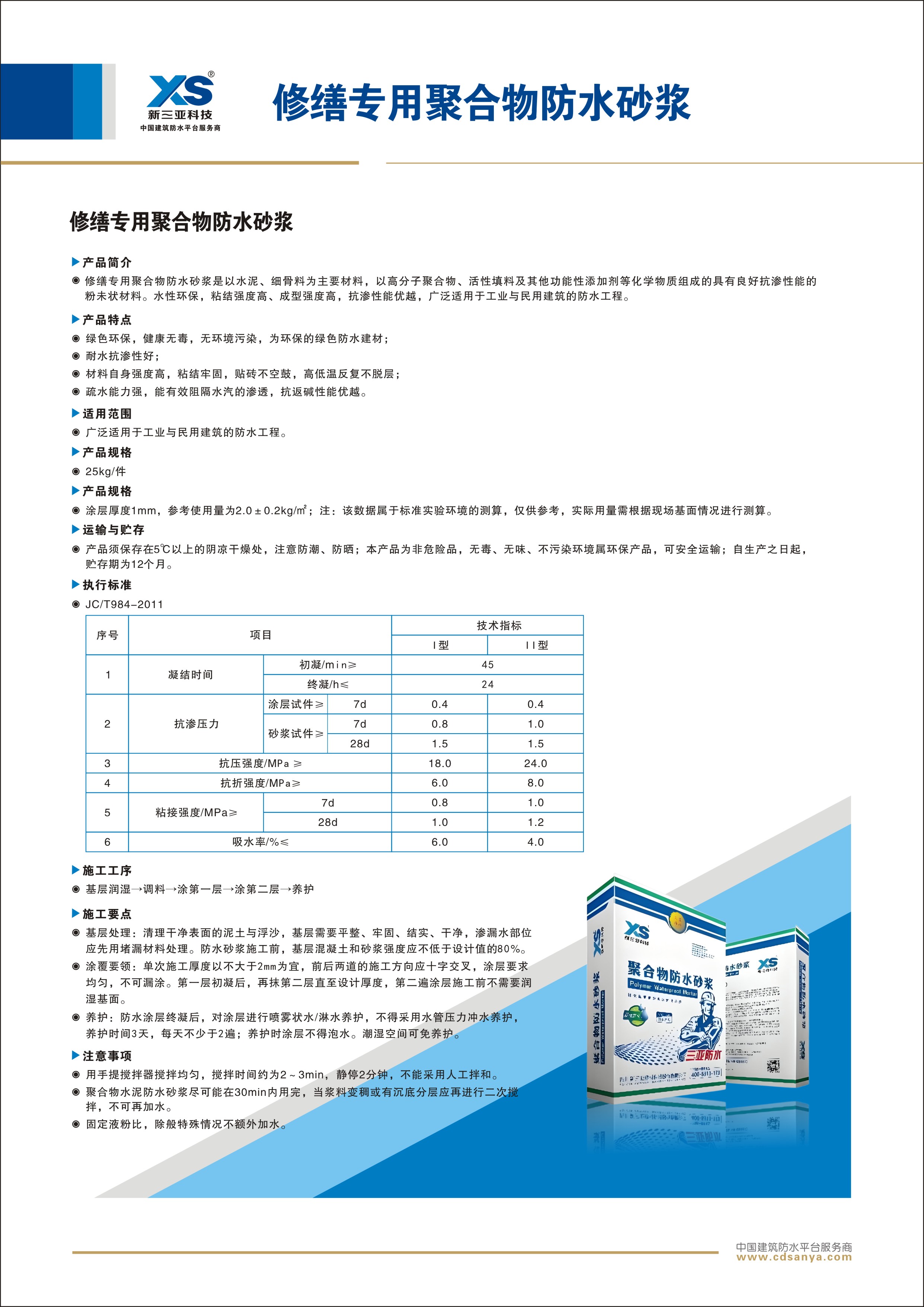 聚合物水泥防水砂漿是是以水泥、細骨料為主要材料,以高分子聚合物、活性填料及其他功能性添加劑等化學物質(zhì)組成的具有良好抗?jié)B性能的粉未狀材料。水性環(huán)保,粘接強度高、成型強度高,抗?jié)B性能優(yōu)越,廣泛適用于工業(yè)與民用建筑的防水工程。