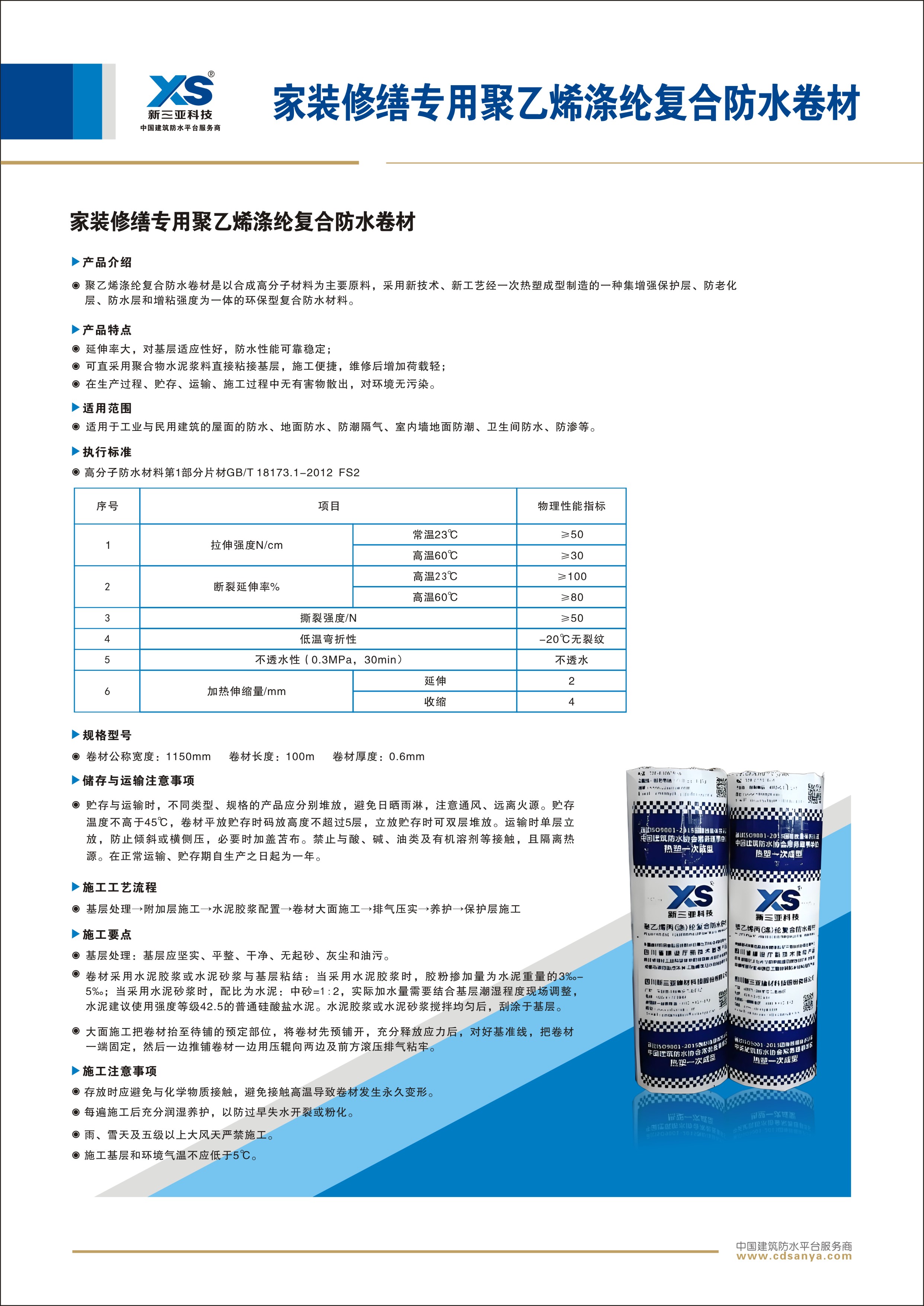 產(chǎn)品簡介: 家裝修繕專用聚乙烯滌綸復(fù)合防水卷材是以合成高分子材料為主要原料,采用新技術(shù)、新工藝經(jīng)一次熱塑成型制造的一種集增強(qiáng)保護(hù)層、防老化層、防水層和增粘強(qiáng)度為一體的環(huán)保型復(fù)合防水材料。 規(guī)格:FS2-PE-50.0m*1.15m*0.60mm |