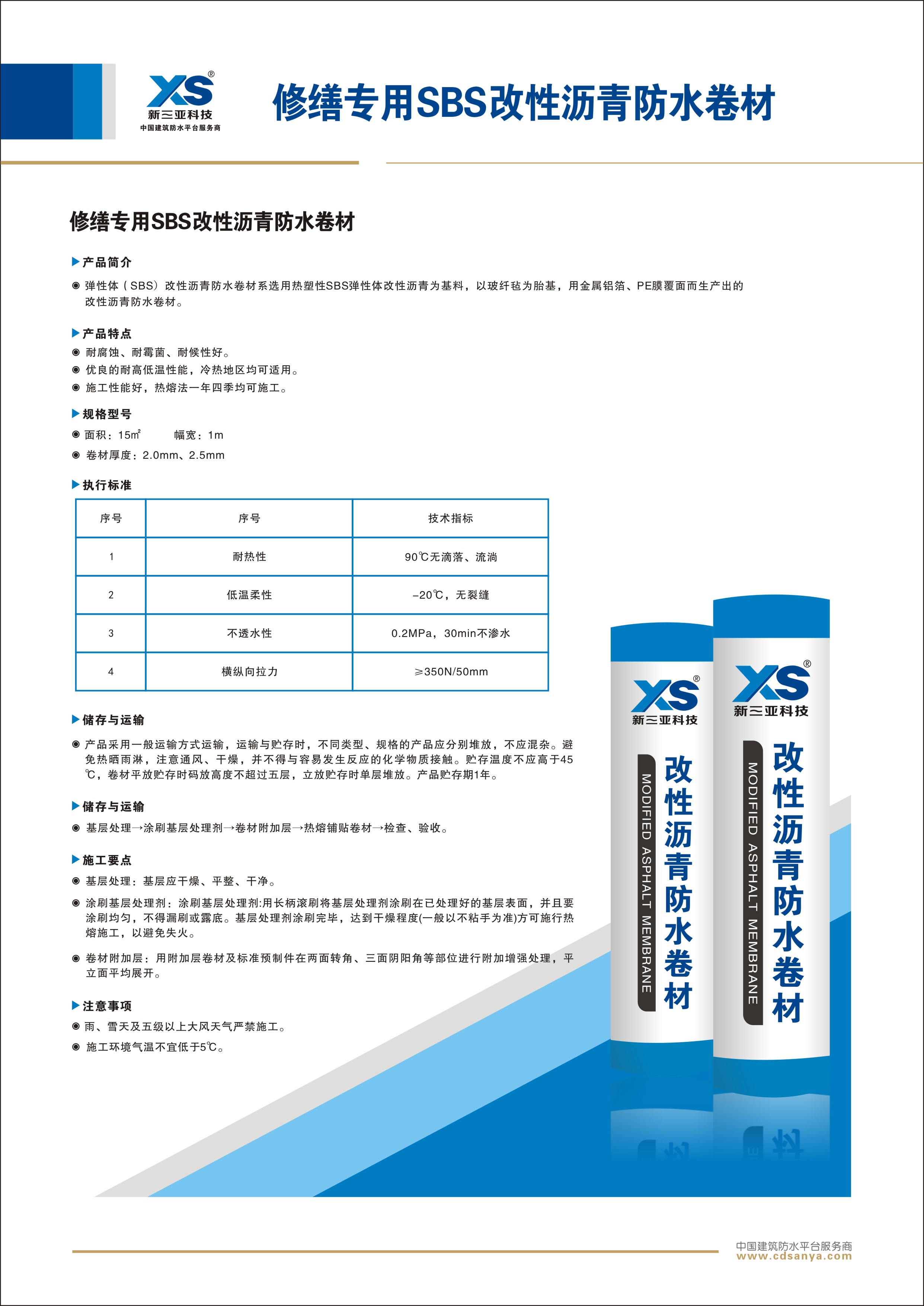 修繕專用SBS改性瀝青防水卷材,選用彈性體(SBS)改性瀝青為基料使用玻纖氈為胎基,并上、下表面覆PE膜而生產出的改性瀝青防水卷材。