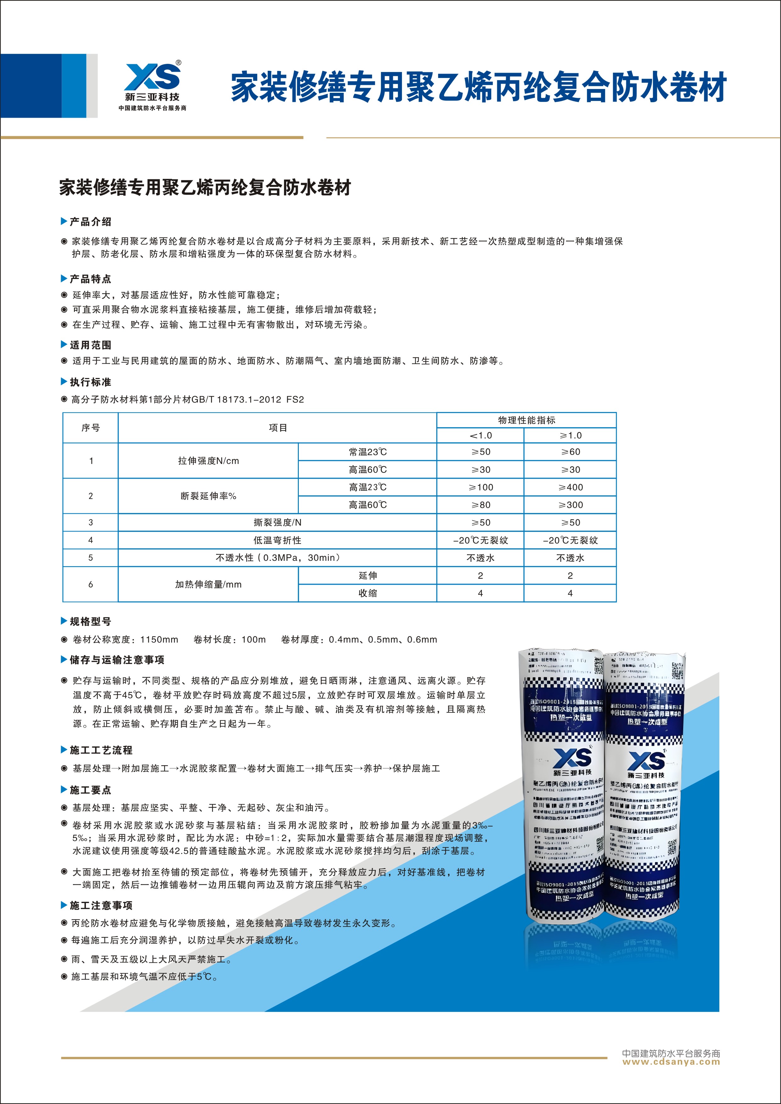 乙烯丙綸復合防水卷材是以合成高分子材料為主要原料,采用新技術(shù)、新工藝經(jīng)一次熱塑成型制造的一種集增強保護層、防老化層、防水層和增粘強度為一體的環(huán)保型復合防水材料。