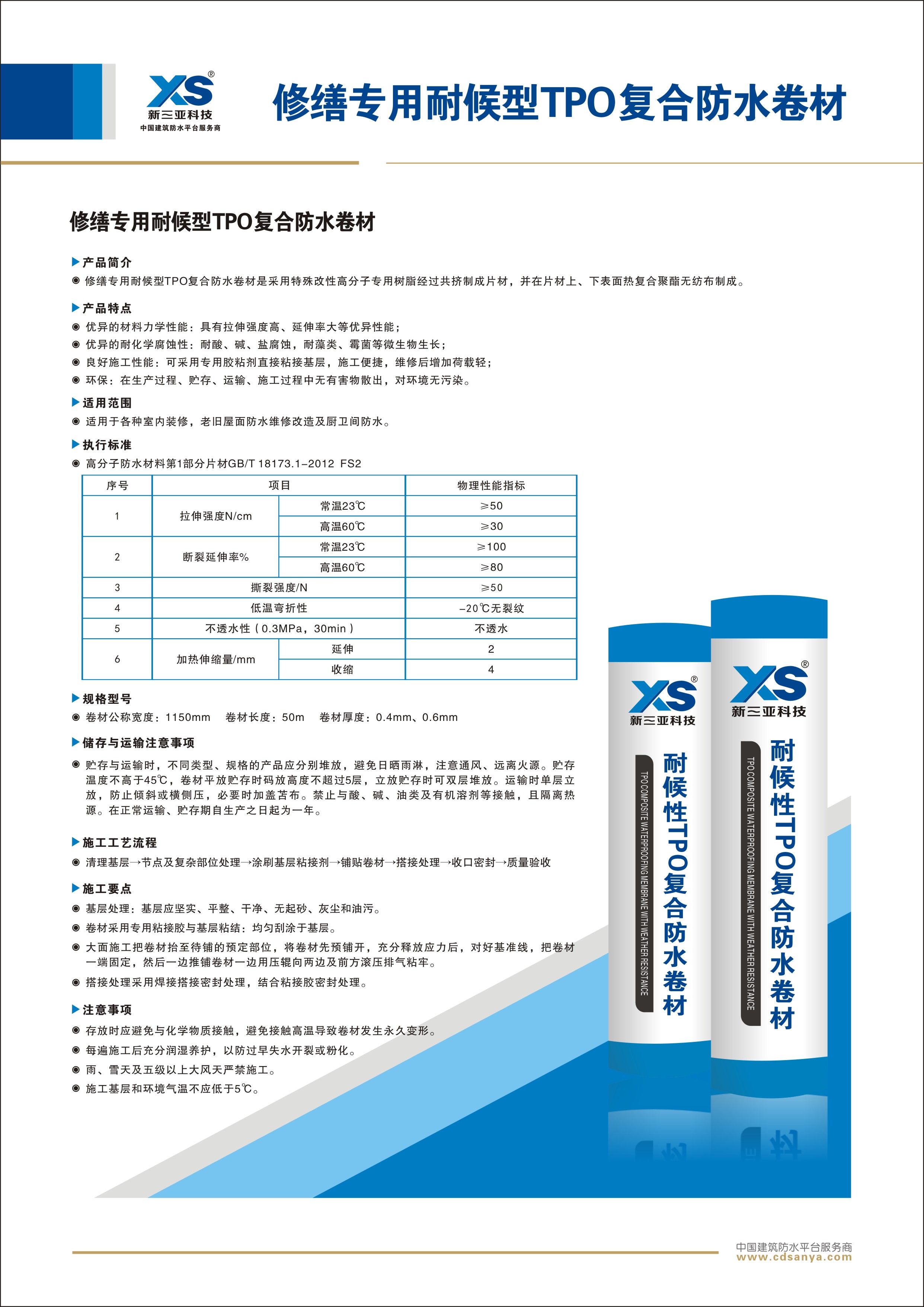 產(chǎn)品簡介: 修繕專用耐候型TPO復(fù)合防水卷材是采用特殊改性高分子專用樹脂經(jīng)過共擠制成片材,并在片材上、下表面熱復(fù)合聚酯無紡布制成。 規(guī)格:FS2-TPO-50.0m×1.15m×0.4mm | ![]() |